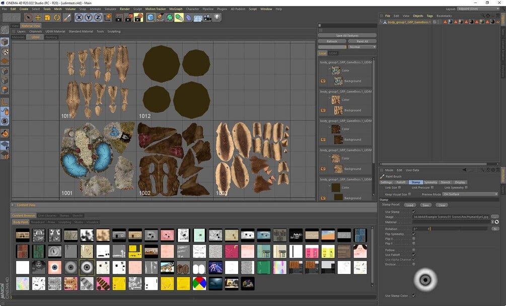• Paint with a sculpting style workflow to paint using stamps, stencils and symmetry onto Standard C4D materials